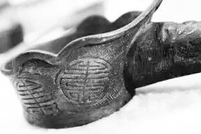 讓我們先看看這個熨斗:這是一件漢代家庭使用的生活工具,從外形來看,它通長28厘米,柄長16厘米,勺徑12厘米。柄、勺分別鑄造后焊接而成,勺圓口,寬折沿,微侈,圓腹,圓底,外沿下一圈弦邊。沿下焊柄,柄呈平面,圓底條狀,柄首呈張口龍頭形,勺內有黑色炭跡。這是兩千年前漢代人使用時留下來的痕跡。在勺的外側,還有一塊類似銘文的東西。