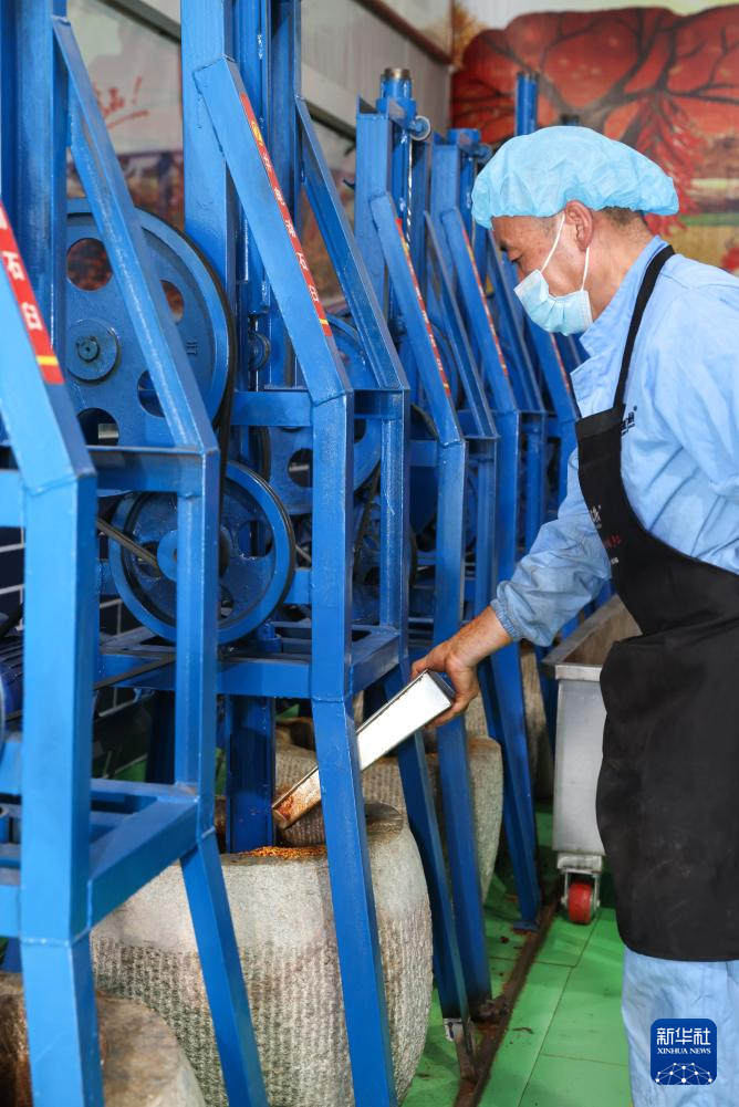 7月22日,工作人員在甘肅天水市甘谷縣安遠(yuǎn)鎮(zhèn)的辣椒烘干和加工車間里操作電動石臼。新華社記者 呂帥 攝