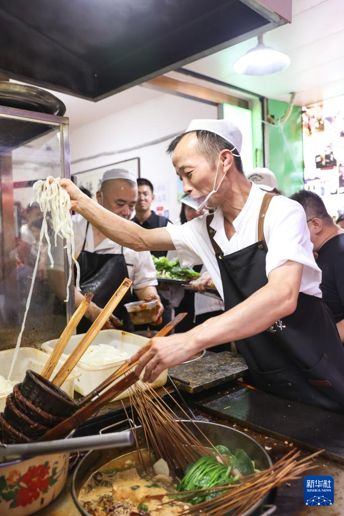 7月22日,在天水市秦州區(qū)天水古城內(nèi)的一家麻辣燙店,店員制作天水麻辣燙。新華社記者 范培珅 攝