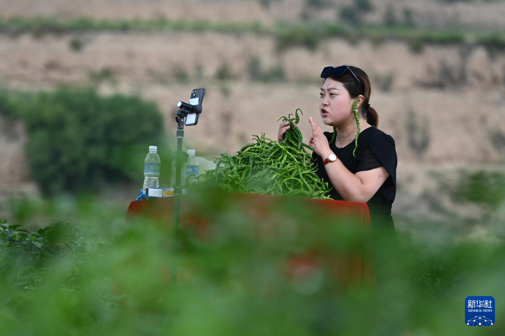 7月22日,在天水市甘谷縣新興鎮(zhèn)侯家溝村的辣椒生產(chǎn)基地,工作人員直播銷售辣椒。新華社記者 范培珅 攝