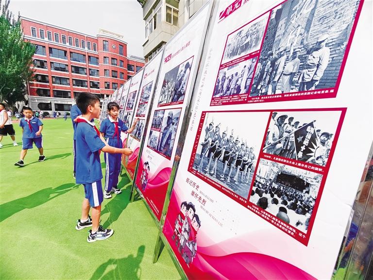 活動現(xiàn)場,該館講解員給孩子們講述了《抗戰(zhàn)烽火中的少年兒童》及《英雄血灑黃河畔——叢德滋》紅色故事。之后,蘭州市口琴藝術(shù)交流學(xué)會的成員現(xiàn)場演奏了《沒有共產(chǎn)黨就沒有新中國》《游擊隊(duì)之歌》《中國少年先鋒隊(duì)隊(duì)歌》等經(jīng)典紅色曲目。圖為學(xué)生觀看展板。