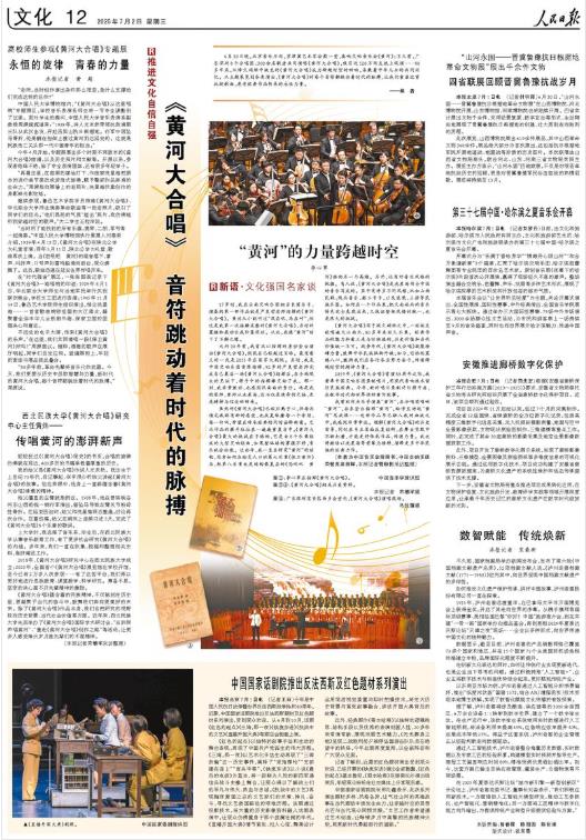 6月30日晚,北京音樂(lè)廳內(nèi),京津冀藝術(shù)家會(huì)聚一堂,奏響交響音樂(lè)會(huì)《黃河》;不久前,廣東深圳8個(gè)合唱團(tuán)、300余名歌者共同演唱《黃河大合唱》,吸引近120萬(wàn)網(wǎng)友線(xiàn)上觀(guān)演……80多年來(lái),從烽火硝煙中誕生的《黃河大合唱》成為跨越時(shí)空的回響,承載著中華兒女的共同記憶。從主題展覽到各類(lèi)演出,《黃河大合唱》的每個(gè)音符都跳動(dòng)著時(shí)代的脈搏,讓我們重溫這首抗戰(zhàn)歌曲,感受經(jīng)典作品傳承的永恒力量。