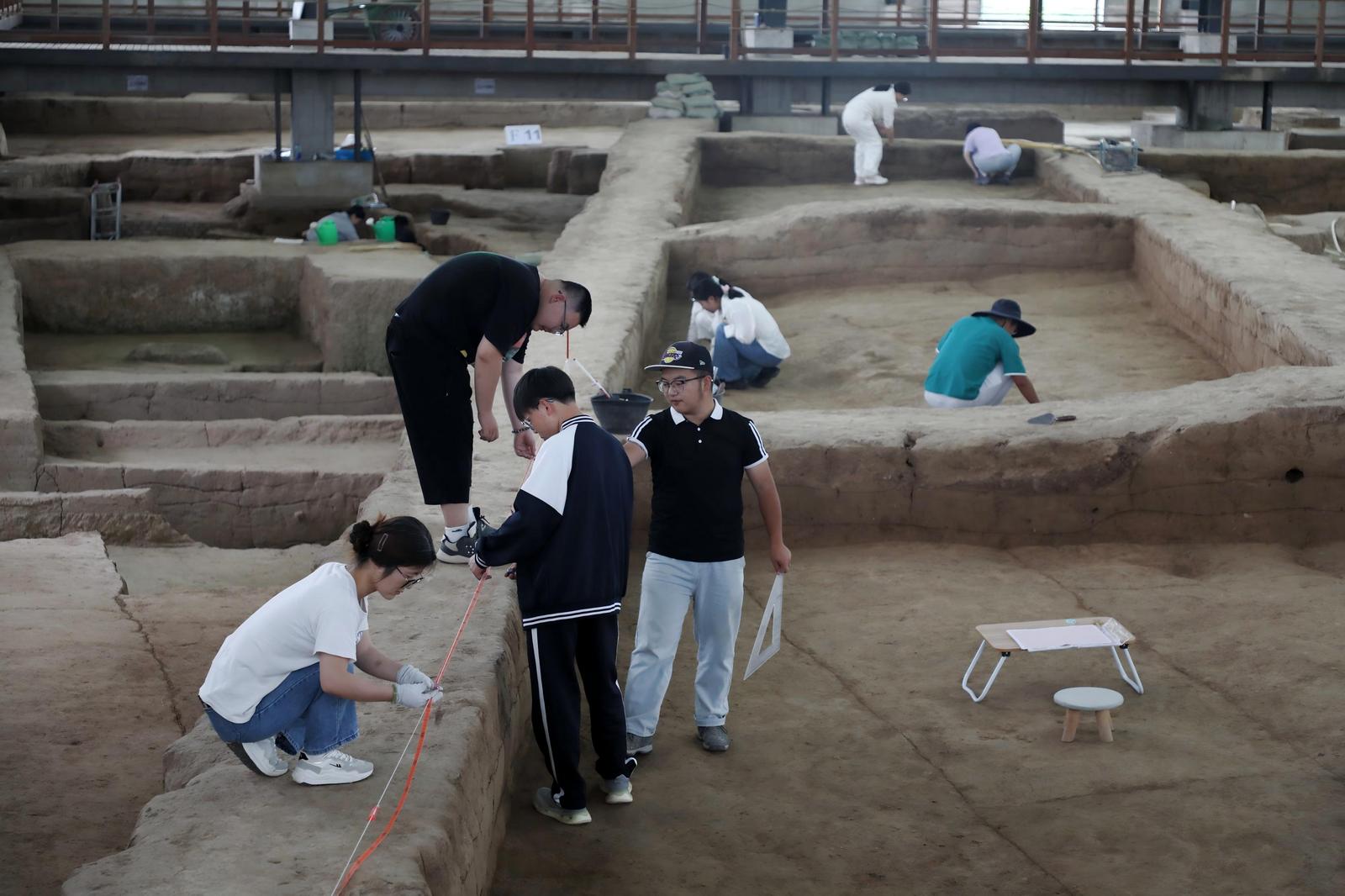 不遠(yuǎn)處,另外幾名學(xué)生也在各自負(fù)責(zé)的探方內(nèi)忙碌著,畫線、找邊、測(cè)量、繪圖,他們用手中的工具,在土層中探尋著慶陽文明脈搏的古老印記。
