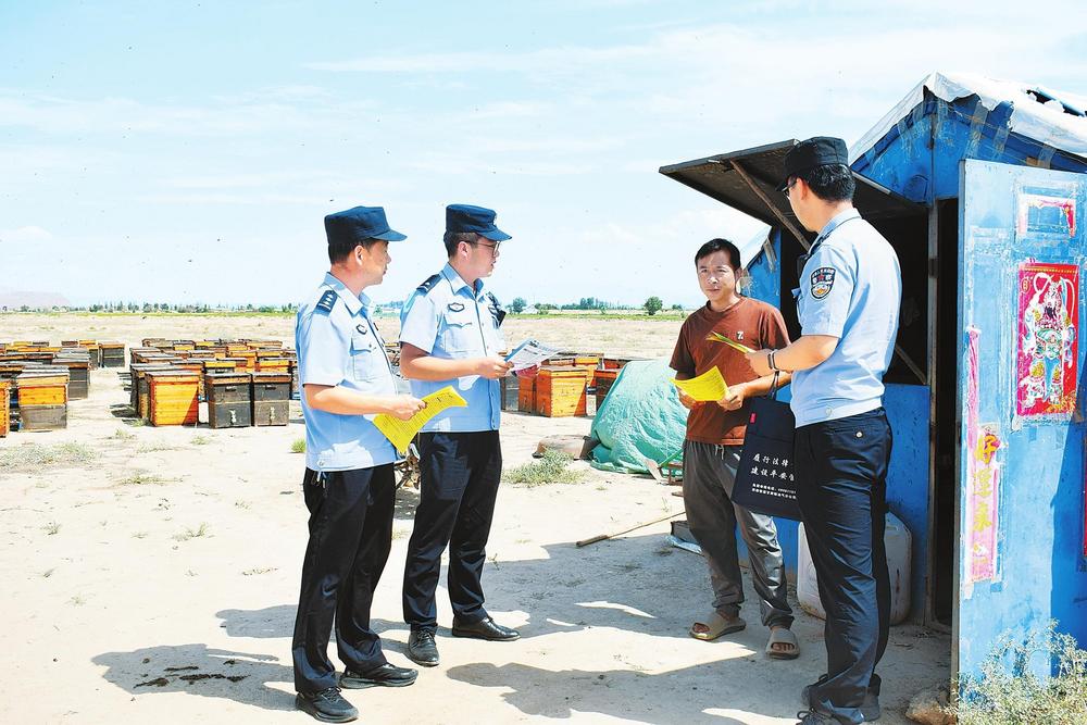 民警走進(jìn)蜂場(chǎng)宣傳安全知識(shí)。新甘肅·甘肅法治報(bào)通訊員王承棟攝
