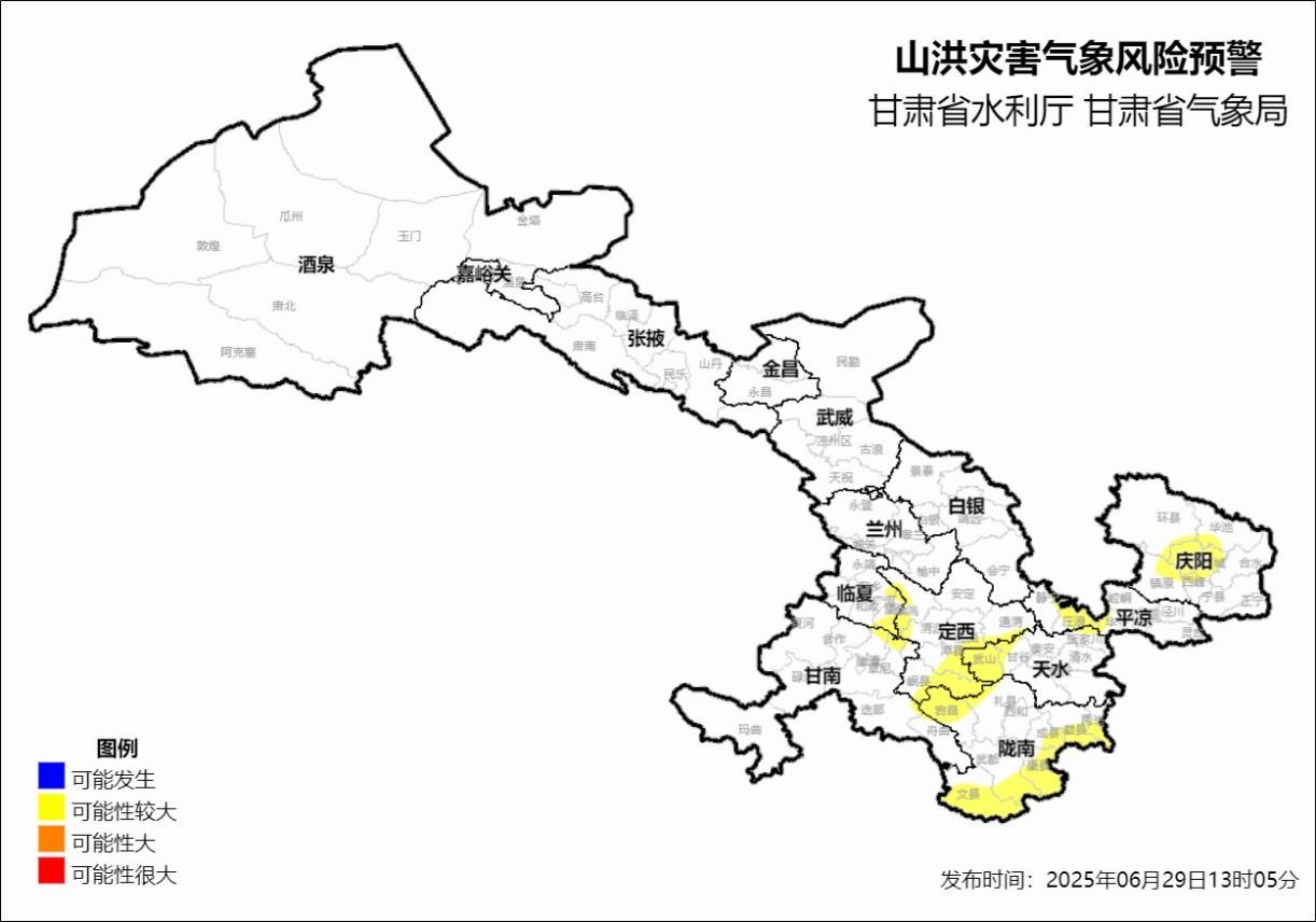 根據(jù)省氣象局《重大氣象信息專報》(2025年甘氣第10期),未來十天甘肅省多降水天氣,具有對流性強、小時雨強大、累積雨量大等特點,洪水災(zāi)害風(fēng)險高。6月29日13時,省水利廳、省氣象局聯(lián)合發(fā)布山洪災(zāi)害氣象風(fēng)險預(yù)警:預(yù)計,6月29日14時至30日14時,白銀市(景泰縣),武威市(古浪縣),定西市(臨洮縣、渭源縣、通渭縣、隴西縣、漳縣、岷縣),臨夏州(廣河縣、東鄉(xiāng)縣、康樂縣),甘南州(臨潭縣、卓尼縣、舟曲縣、迭部縣),天水市(秦安縣、甘谷縣、武山縣、張家川縣),隴南市(宕縣、禮縣、武都區(qū)、成縣、文縣、康縣、徽縣、兩當縣),平?jīng)鍪校o寧縣、崆峒區(qū)、華亭市、莊浪縣),慶陽市(西峰區(qū)、慶城縣、環(huán)縣、華池縣、鎮(zhèn)原縣)等地區(qū)發(fā)生山洪災(zāi)害可能性較大(黃色預(yù)警)。