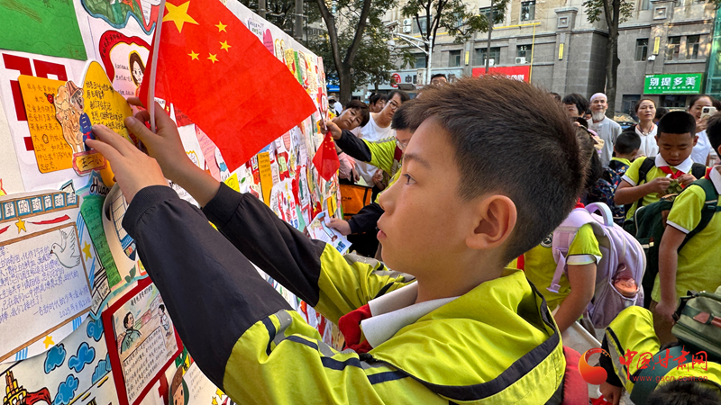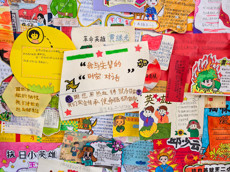 早上八點(diǎn),孩子們手執(zhí)鮮艷的國(guó)旗,踏著《歌唱祖國(guó)》《我們是共產(chǎn)主義接班人》的歌聲步入校園。在校門(mén)口設(shè)立的“我與先輩的時(shí)空對(duì)話”打卡墻成為情感表達(dá)的窗口,孩子們用真摯的語(yǔ)言寫(xiě)下對(duì)先輩的崇敬與承諾:“我們會(huì)讓祖國(guó)更強(qiáng)大”“我們會(huì)像愛(ài)護(hù)紅領(lǐng)巾一樣愛(ài)護(hù)祖國(guó)”。一字一句,跨越時(shí)空,傳遞著少年對(duì)歷史的回應(yīng)和對(duì)未來(lái)的擔(dān)當(dāng)。