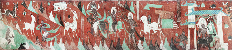 這幅壁畫在藝術(shù)風(fēng)格上獨(dú)樹一幟,深受中原繪畫形式的影響。它既摒棄了印度壁畫的環(huán)形構(gòu)圖方式,又不同于龜茲壁畫里的菱形畫面布局,而是開創(chuàng)性地采用了連環(huán)畫式的長(zhǎng)卷式構(gòu)圖,宛如一條歷史的長(zhǎng)河,將故事娓娓道來。