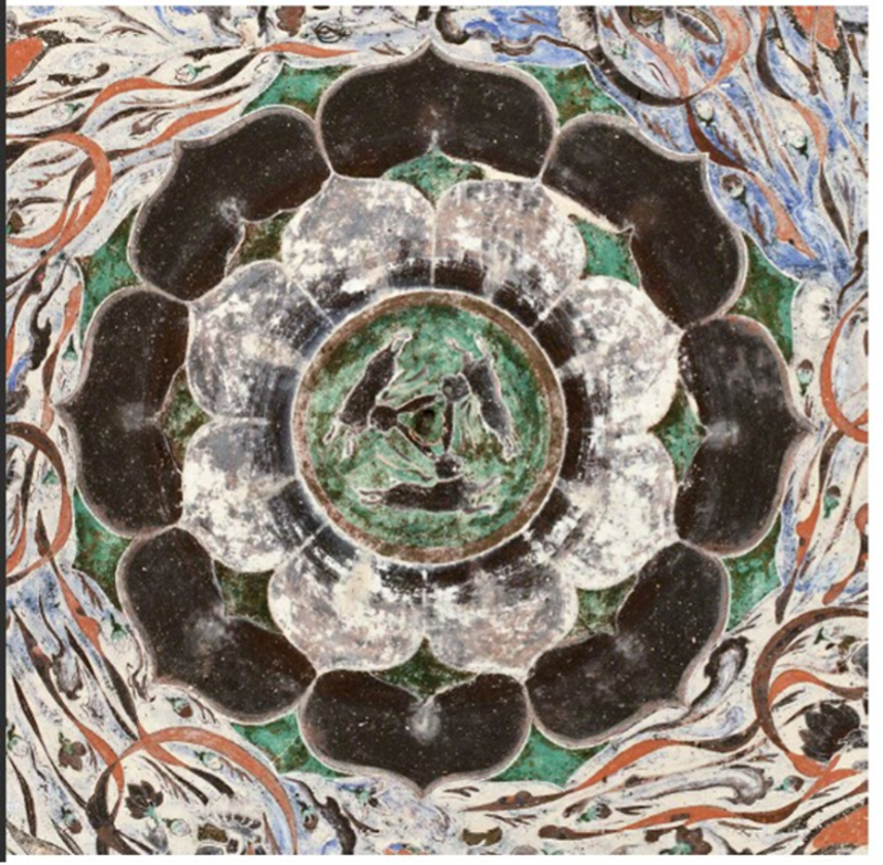 踏入窟內(nèi),仰頭凝望,藻井中央那朵八瓣蓮花宛如夜空中綻放的星辰,花瓣層層疊疊,細(xì)膩而生動。蓮花中央,是獨(dú)具匠心的三兔連耳圖案。