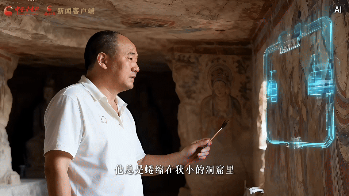 李波接過父親李云鶴的接力棒,操作AI系統(tǒng)開展修復工作,他遵循 “干一行、愛一行,鉆一行、精一行” 的理念,從學徒成長為“全國技術能手”,讓“莫高精神”在戈壁灘延續(xù)。