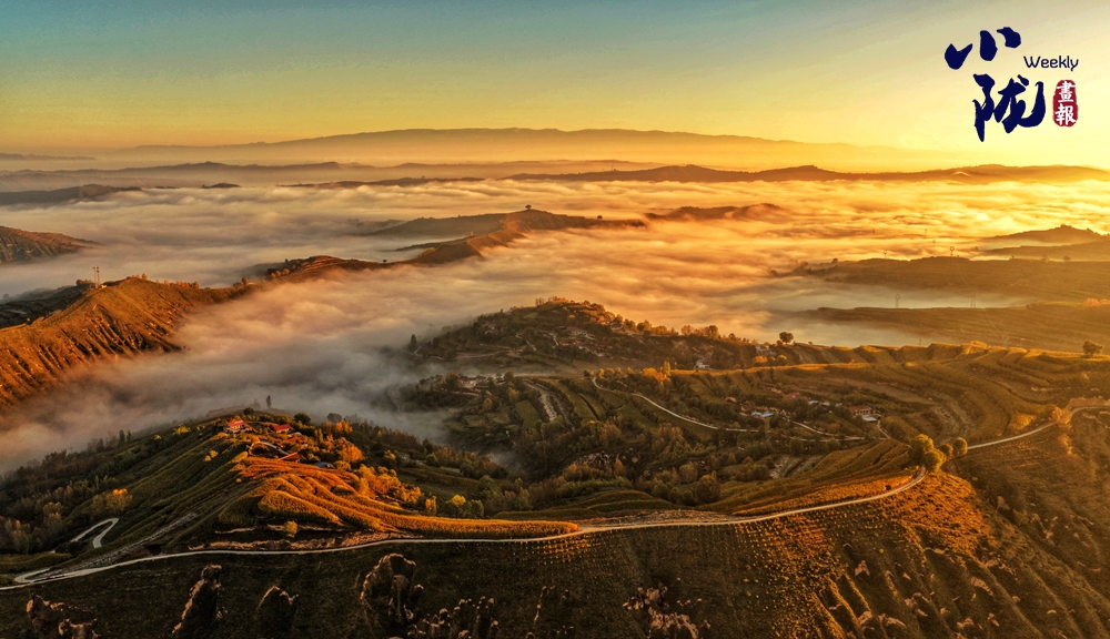 仿佛一夜之間,大北山被染成了暖黃色。極目遠眺,云海漫過蒼翠的山脊,與天邊燃燒的晚霞交融成流動的錦緞,夢幻般的色彩恣意鋪張,金色與藍天、山坳交織在一起,格外溫馨浪漫。
