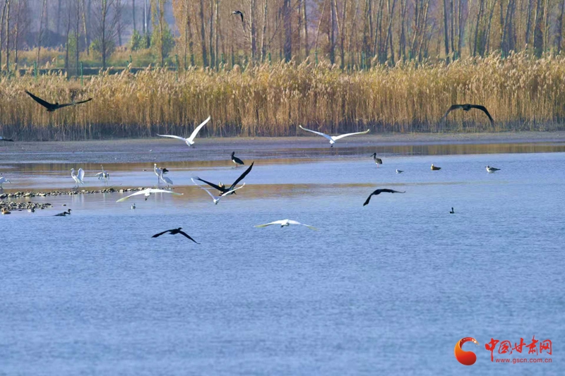 11月10日,初冬寒意漸濃,臨澤流沙河景區(qū)與雙泉湖水庫蘆葦叢間,響起遷徙鳥類的“集結(jié)號(hào)”。潔白的白鸛舒展雙翼、翩躚飛舞,成群麻鴨、鸕鶿緊隨而至,齊聚水域與葦蕩之間,為初冬景致添上靈動(dòng)一筆,引得市民游客駐足抓拍。