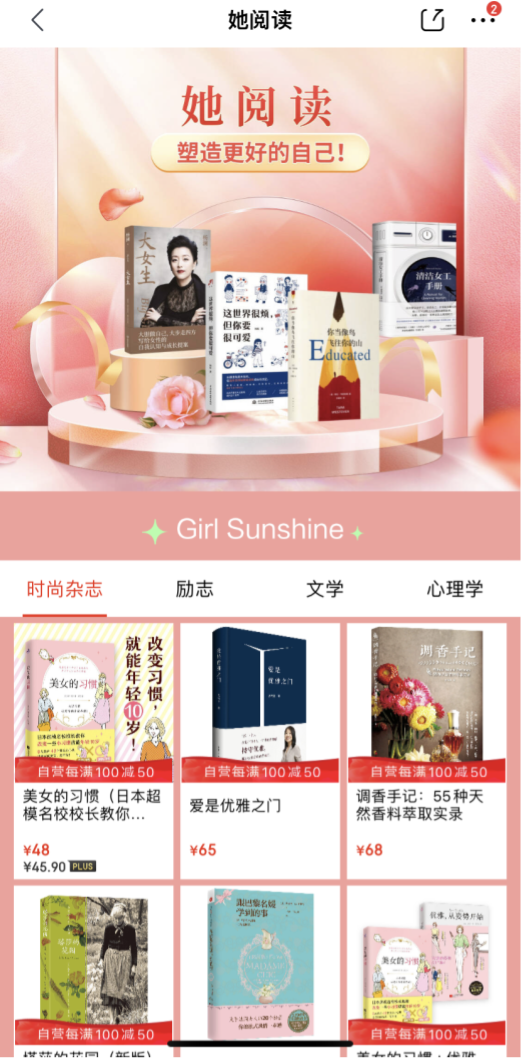 本報(bào)訊(記者 張君成)近年來(lái),女性讀物的數(shù)量均呈上升趨勢(shì),通過(guò)閱讀讓自己的精神生活更加充盈豐富,成為當(dāng)下許多女性的選擇。近日,京東圖書(shū)推出“她閱讀”專(zhuān)場(chǎng)活動(dòng),精選適合女性閱讀的文學(xué)、生活、勵(lì)志、健康等書(shū)籍,滿(mǎn)足熱愛(ài)閱讀的女性精神上的“悅己化”需求?;顒?dòng)期間,自營(yíng)圖書(shū)享每滿(mǎn)100減50的優(yōu)惠。