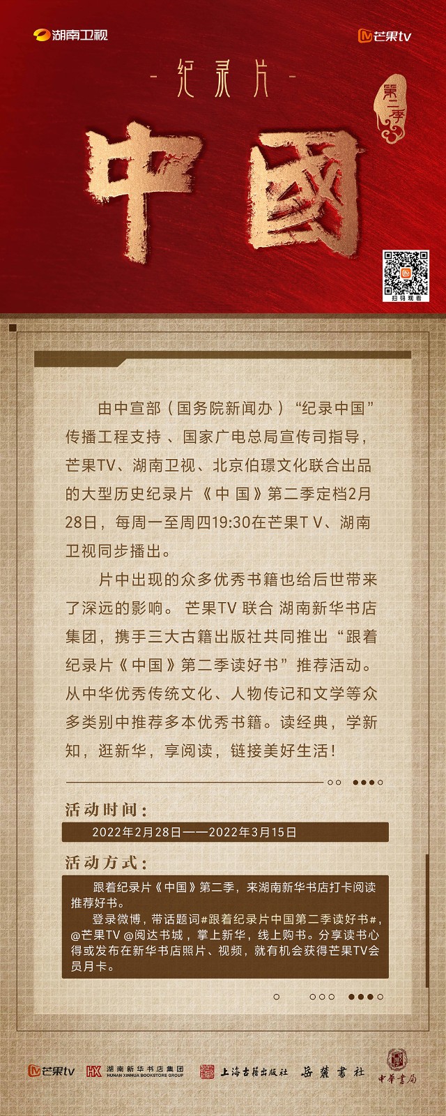 芒果TV以紀(jì)錄片《中國》第二季的精美品質(zhì),聯(lián)合湖南新華書店集團(tuán)的美譽(yù)口碑,將中華書局、上海古籍出版社、岳麓書社推薦的珍品好書,傾情向大眾推薦。本次“跟著紀(jì)錄片《中國》第二季讀好書”活動(dòng),將從2月28日持續(xù)到3月15日,湖南新華書店集團(tuán)旗下湖南圖書城、不吝Boolink書店、全省市級(jí)中心門店、長(zhǎng)沙地區(qū)樂之書店等全員參與,推薦紀(jì)錄片《中國》第二季。書友及觀眾可登錄微博或到線下門店打卡參與活動(dòng)。