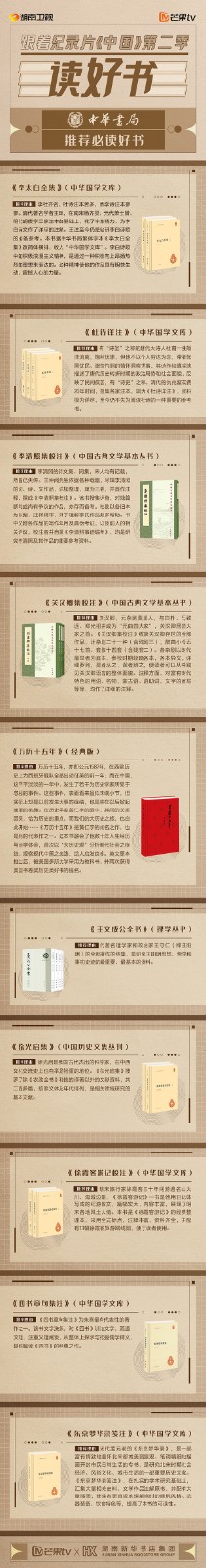 紅網(wǎng)時(shí)刻3月7日訊(通訊員 王平)紀(jì)錄片《中國》第二季每周一至周四19點(diǎn)30分,芒果TV、湖南衛(wèi)視正在熱播,為了更好地傳播中國故事,讓不朽人物和偉大思想突破影像空間的限制,可知、可感、可觸地融入日常生活,芒果TV聯(lián)合湖南新華書店集團(tuán),攜手中華書局、上海古籍出版社、岳麓書社共同推出“跟著紀(jì)錄片《中國》第二季讀好書”推薦活動(dòng),共享閱讀,鏈接美好生活,傳遞人文情懷。