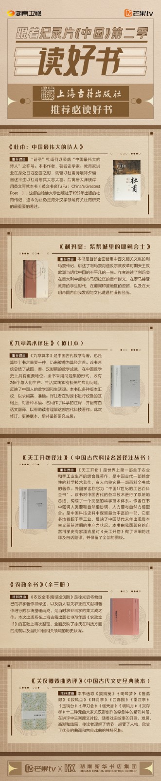 紀(jì)錄片《中國》第二季中,那些閃耀的“群星”,穿過歷史迷霧,用文字記錄璀璨歷史。一些給后世帶來深遠(yuǎn)影響的書籍,如穿過山川大地的季風(fēng),映照一個(gè)時(shí)代的思想源變和文化繁榮。中華書局、上海古籍出版社、岳麓書社在《中國》第二季熱播期間,縱覽歷史文化、人物傳記、文學(xué)名著等書籍類別,精選《杜甫:中國最外大的詩人》《農(nóng)政全書》《元曲三百首》《徐霞客游記校注》《東京夢(mèng)華錄箋注》等近20本優(yōu)秀書籍,推薦全民閱讀。