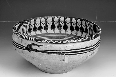 舞蹈紋彩陶盆,馬家窯文化,1995年7月青海省同德縣宗日遺址157號(hào)墓出土。圖片選自《國寶中的黃河文明》