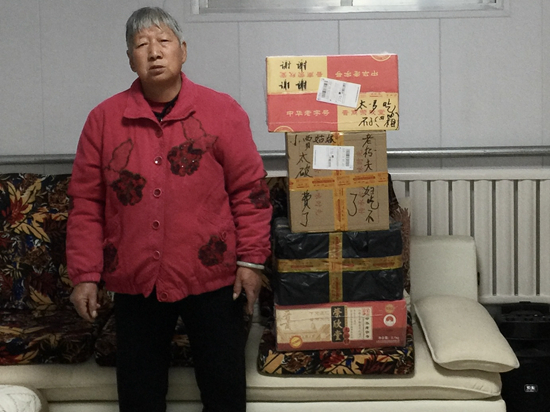 收到賈永婷寄的快遞,孫洪正會把字大大地寫在快遞紙箱上,讓老伴站在那一摞箱子旁邊,拍張照以示“收到”。賈永婷看到圖片里的箱子上歪歪扭扭寫滿了“謝謝謝謝”“太多了吃不完”“小賈姑娘太破費了”,總被逗笑。