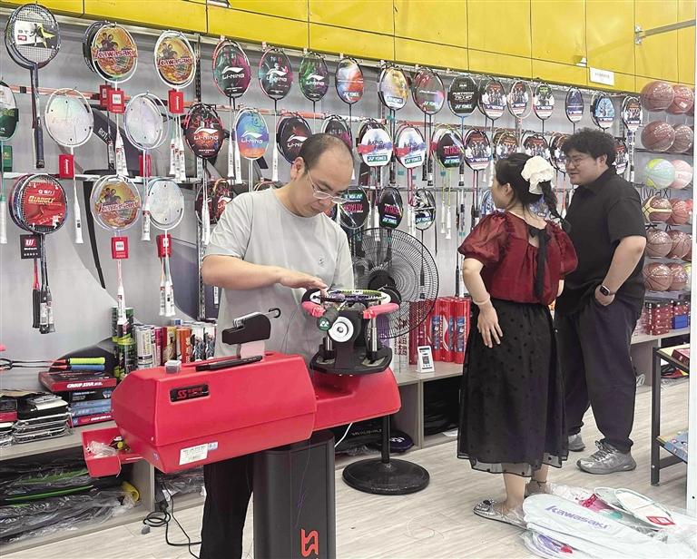 不僅如此,運動用品銷售也迎來小高峰。瑞德摩爾太平洋商場內的健雄體育用品店內,老板正忙著給羽毛球空拍穿線。“我們不僅有現(xiàn)成的羽毛球拍,還可以根據(jù)客戶的需求給空拍穿線。”該店老板介紹,羽毛球拍網(wǎng)線價位30至100元不等,購線還可免手工費。羽毛球初學者一般都會買成品拍自己在家練習,而一些技術較好的顧客除了會選擇品質較好的空拍,還會現(xiàn)場選線拉網(wǎng)定制屬于自己的球拍。“暑假以來,店內羽毛球拍銷量大增,穿線需求也逐漸增多,周末從早忙到晚,每半小時穿一個球拍,最多一天穿24個,排隊等候已成常態(tài)。”此外,不少運動品牌也順勢推出促銷活動,吸引消費者選購。