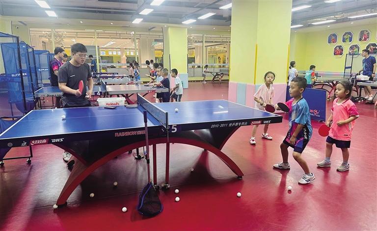 國芳G99一家乒乓球培訓機構內每張球桌前都有教練指導學員練習。“暑期班從7月10日持續(xù)至8月24日,針對零基礎學員推出一對一火箭課培訓。目前,教練時段全滿員,報班需要提前預約。”該機構負責人介紹,機構共推出苗子班、啟蒙營、基礎營等5種班型,按年齡和水平劃分,價位為1480元至2980元。4至6歲孩子可參加一對多的苗子班和啟蒙營,大一些的孩子則可參加基礎營、提高營進行對打訓練。